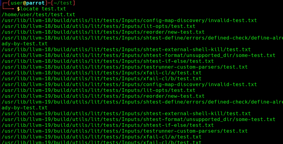 Comme vous pouvez le voir, quand je lance « locate test.txt », la première réponse est la bonne. Il m’indique où se trouve le fichier que je recherche… mais, il existe des tonnes de réponse.