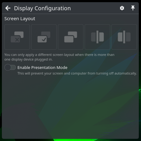 « Display configuration », c’est pour l’affichage, soit vous avez un écran tout simple, normal, soit plusieurs écrans, soit le même écran partagé… de mon côté, c’est du tout simple, normal.