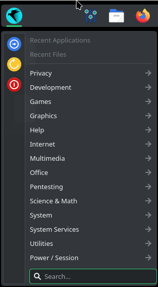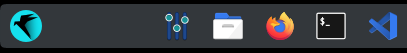 En haut à gauche, vous avez (en partant de la gauche) le logo de Parrot OS qui donne accès à un menu déroulant, le bouton des préférences (le truc bizarre composé de lignes et de points) puis des raccourcis avec 4 applications.