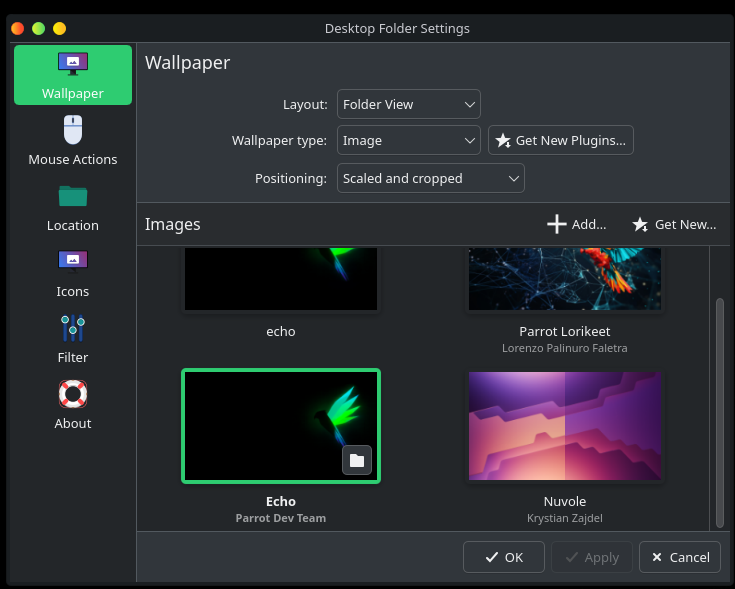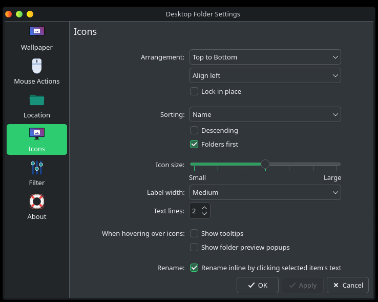 enfin, le filtre de tri sur le bureau et un bouton « au sujet de » (about).