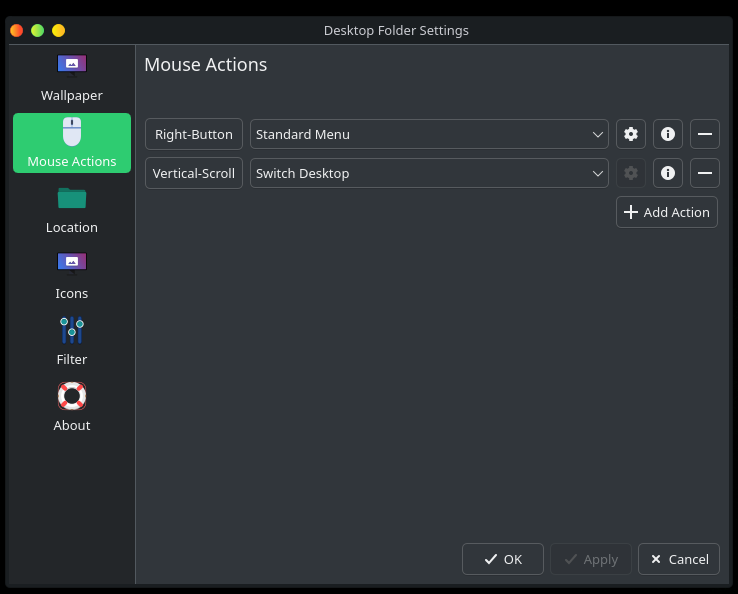 définir ce que fait votre souris (là, le bouton droit ouvre le menu standard et la molette change de bureau virtuel)