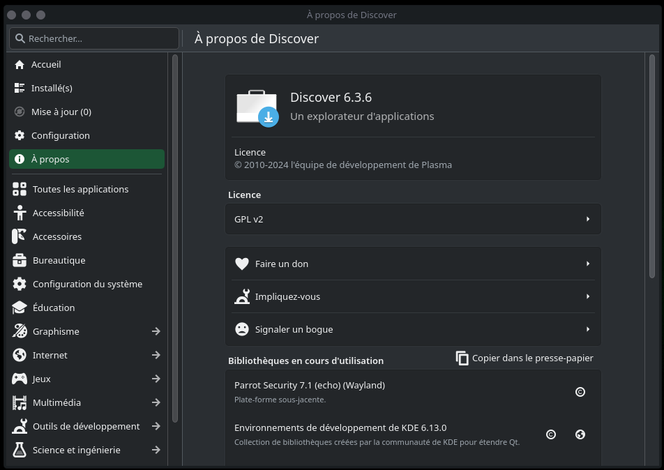 Si vous trouvez comme moi la plupart des catégories sur la gauche vide, c’est normal. Il faut aller dans la partie configuration et sélectionner des sources supplémentaires pour Parrot OS… si je ne me trompe pas.