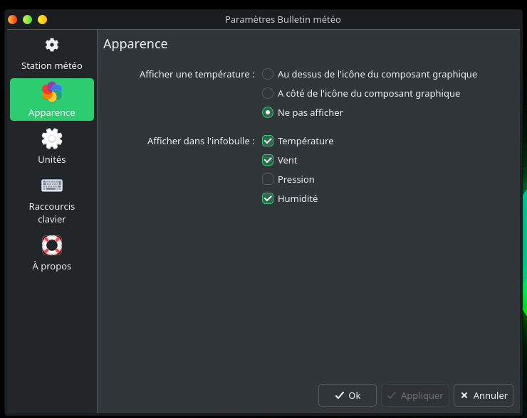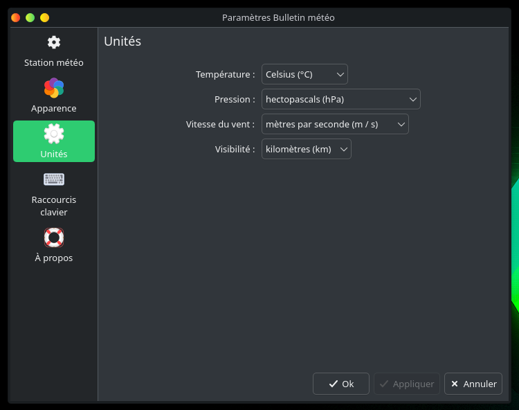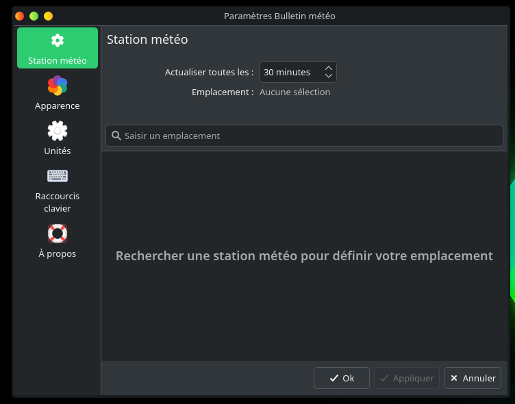 Comme je tiens à garder une certaine harmonie entre mes applications et que kweather est prévu pour KDE plasma, c’est ce que je retiens :