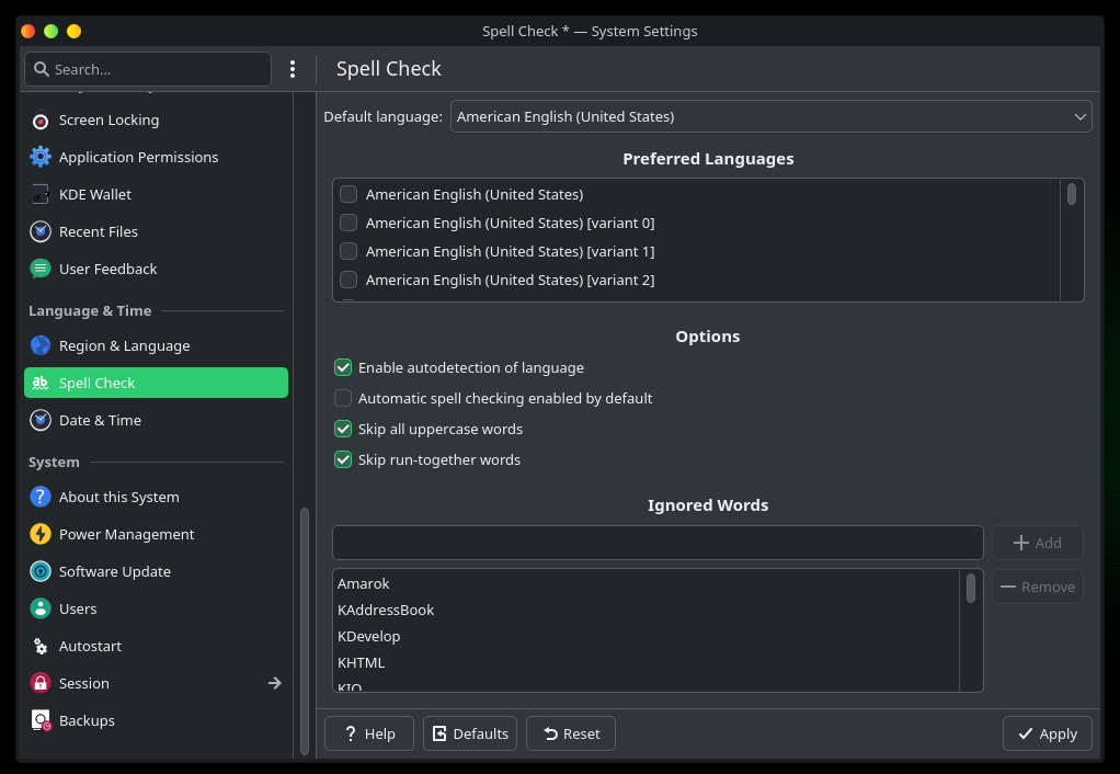 En gros, dans quelle langue voulez-vous votre correcteur orthographique. Il est par défaut sur l’anglais américain.
