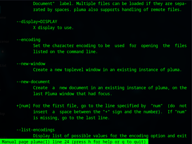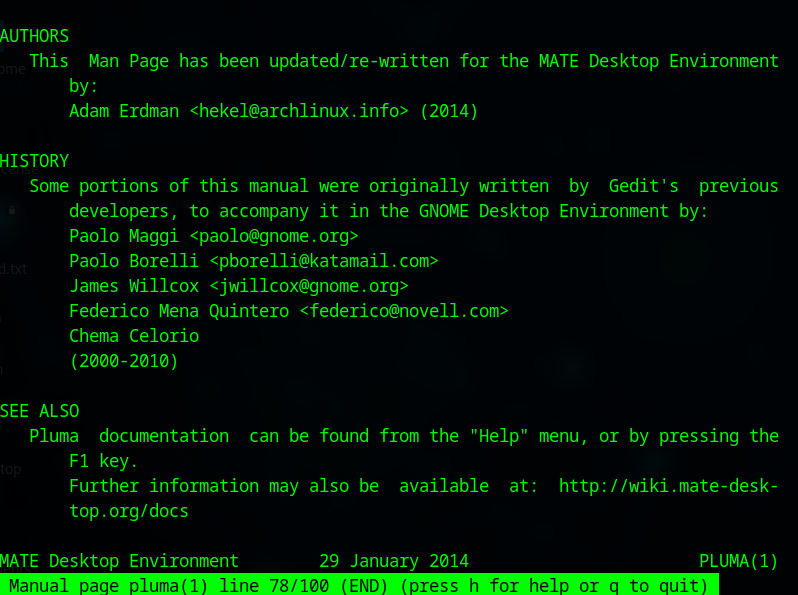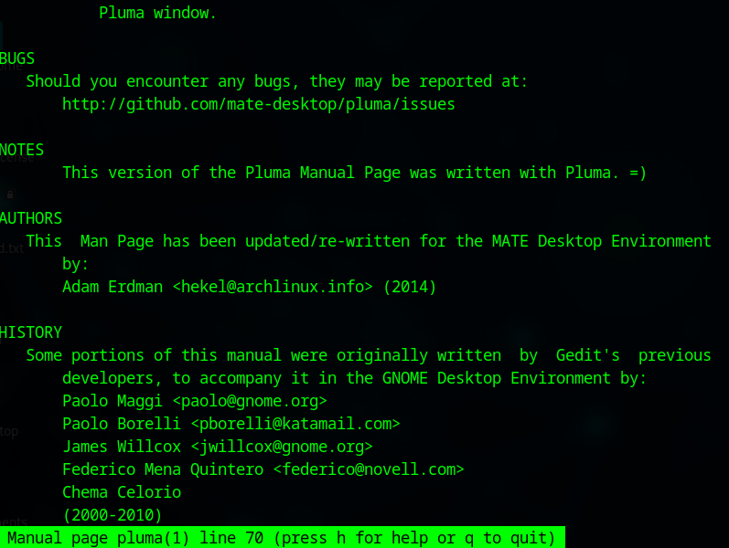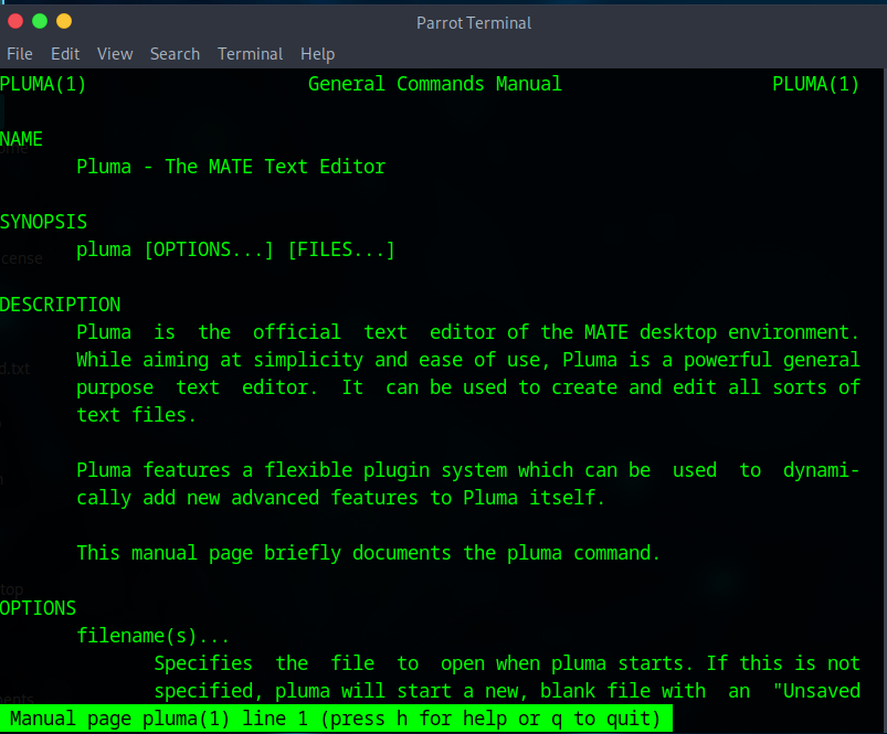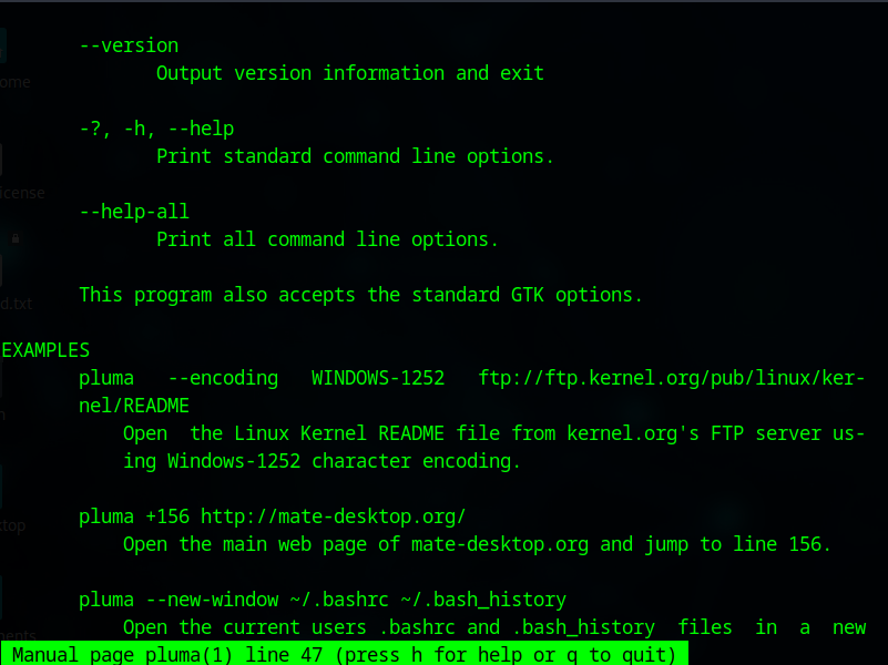 C’est simple d’utilisation, vous tapez man suivi du nom de l’application dont vous avez besoin et voilà. Je précise, c’est valable pour tout, aussi bien pluma comme je vais vous le montrer que ls, cd, nmap, etc.